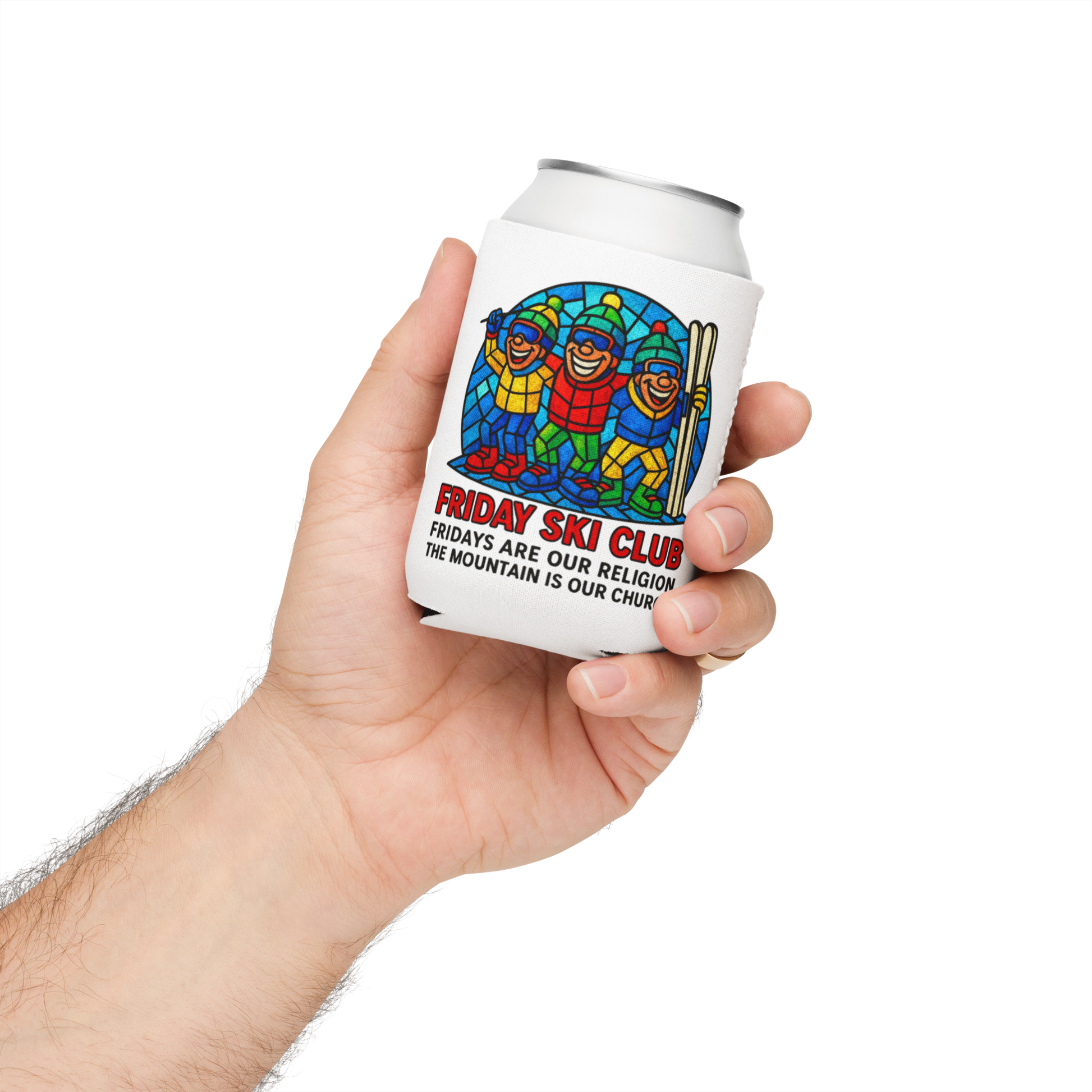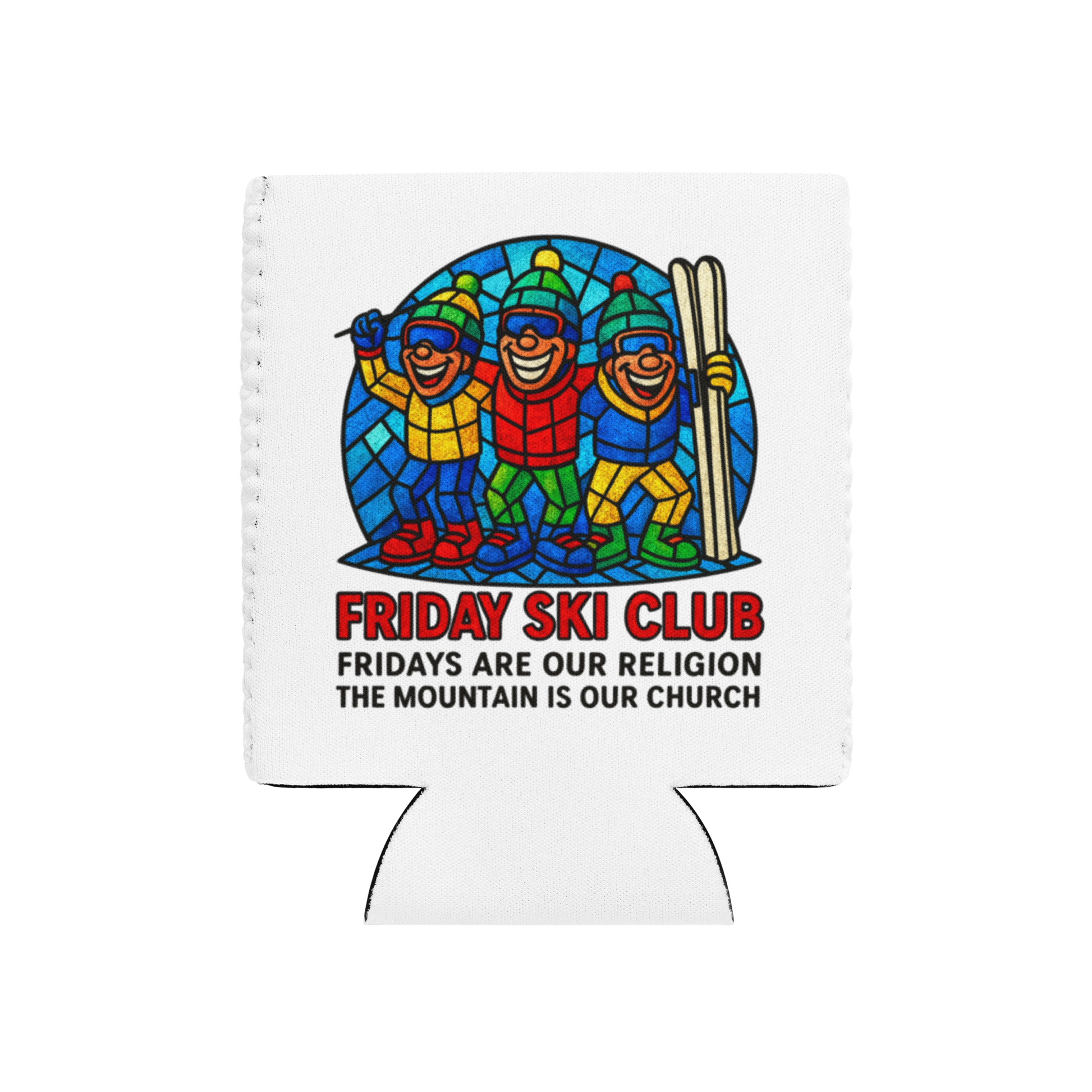 Bring a little mountain magic to your gear with this bold, stained-glass inspired Friday Ski Club design. Our iconic three-skier crew is reimagined as a glowing chapel window — a tribute to every rider who treats Fridays like sacred ground and the mountain like their church.